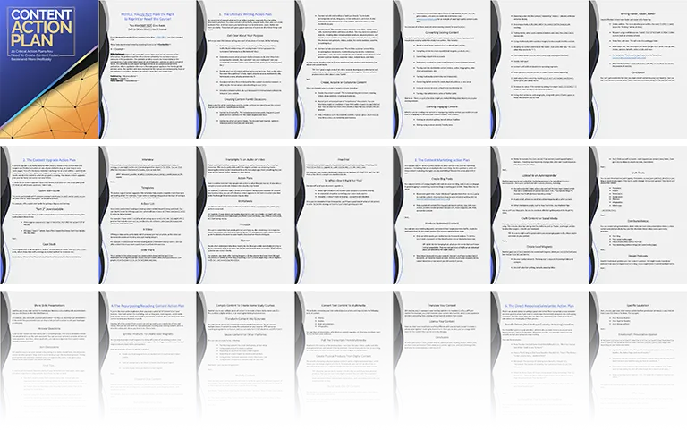 You’ll go from being overwhelmed to overjoyed once you see what these 20 action plans can do for you. I’ve taken an entire multi-volume encyclopedia set of content creation and usage information and digested it down to the bare minimum of what you need to know to get great results.